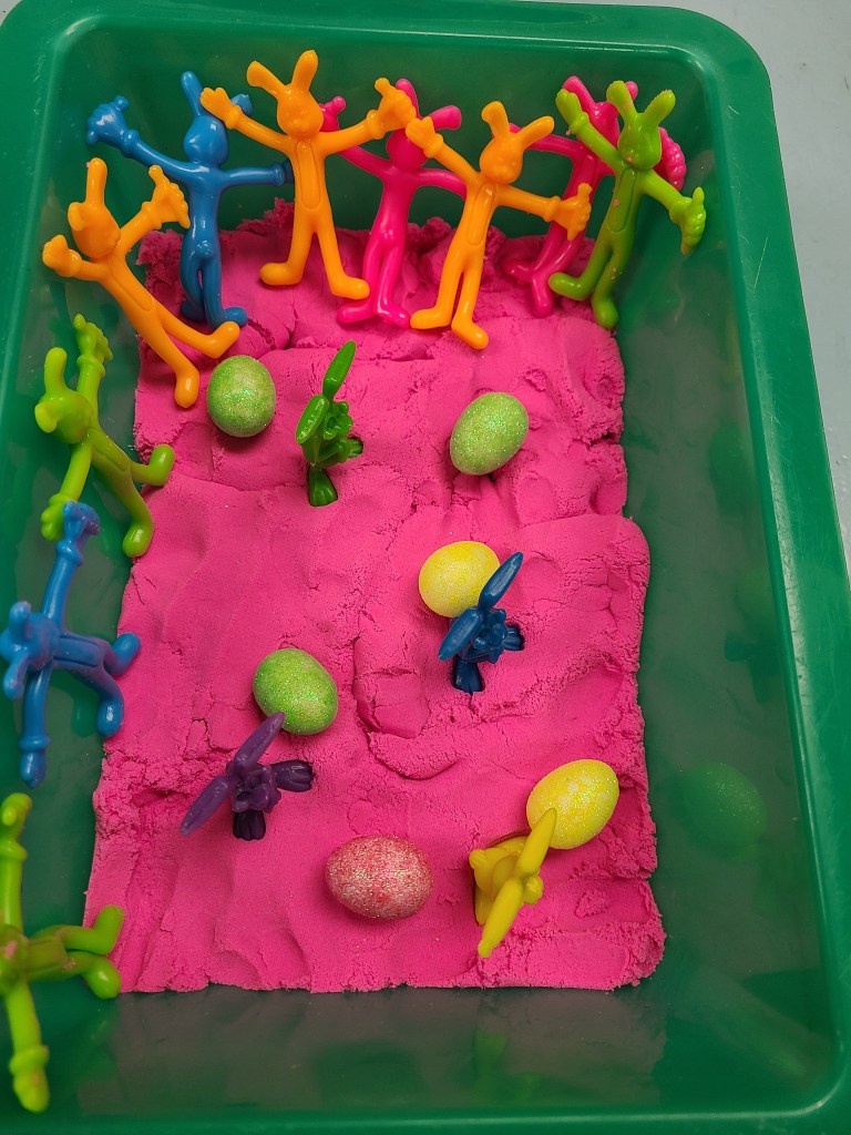Our sensory table was a hit, filled straw and little bunnies and eggs. It was a sensory delight for the children, sparking their curiosity and imagination.
