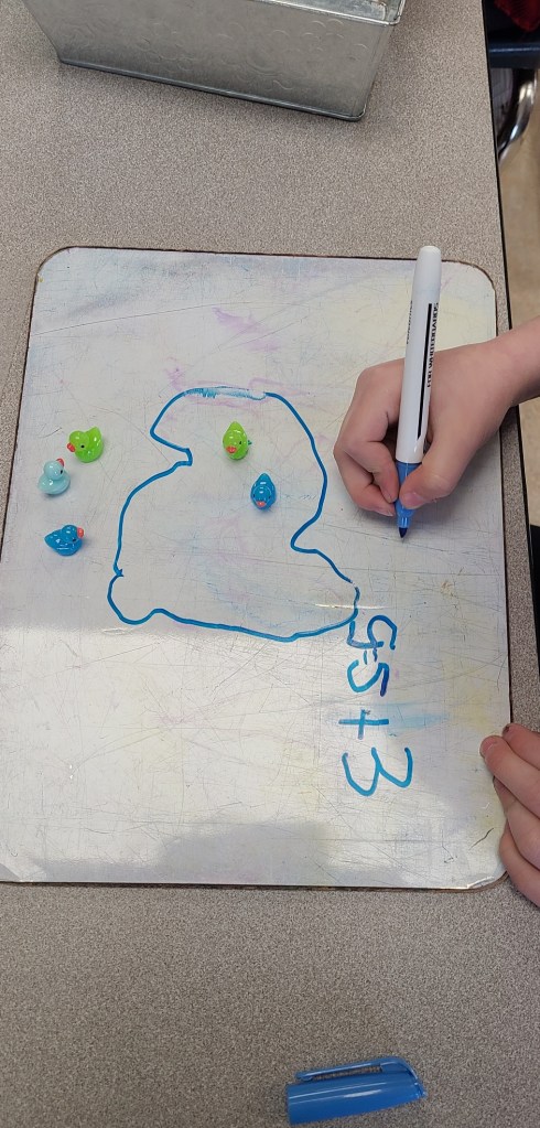 Our Easter week in Kindergarten ended on a high note with a fun and creative exploration into math problem solving through the use of real world problems. We started on Wednesday with learning the song “5 Little Ducks” and then we each got 5 little ducks and practiced figuring out the different combinations of 5. Thursday we moved onto “5 Green and Speckled Frogs” and worked on combinations of frogs on the log and frogs in the water. Finally we ended the week with “5 Little Dinosaurs” and worked on combinations of Dinosaurs and Dinosaur eggs (pom poms).